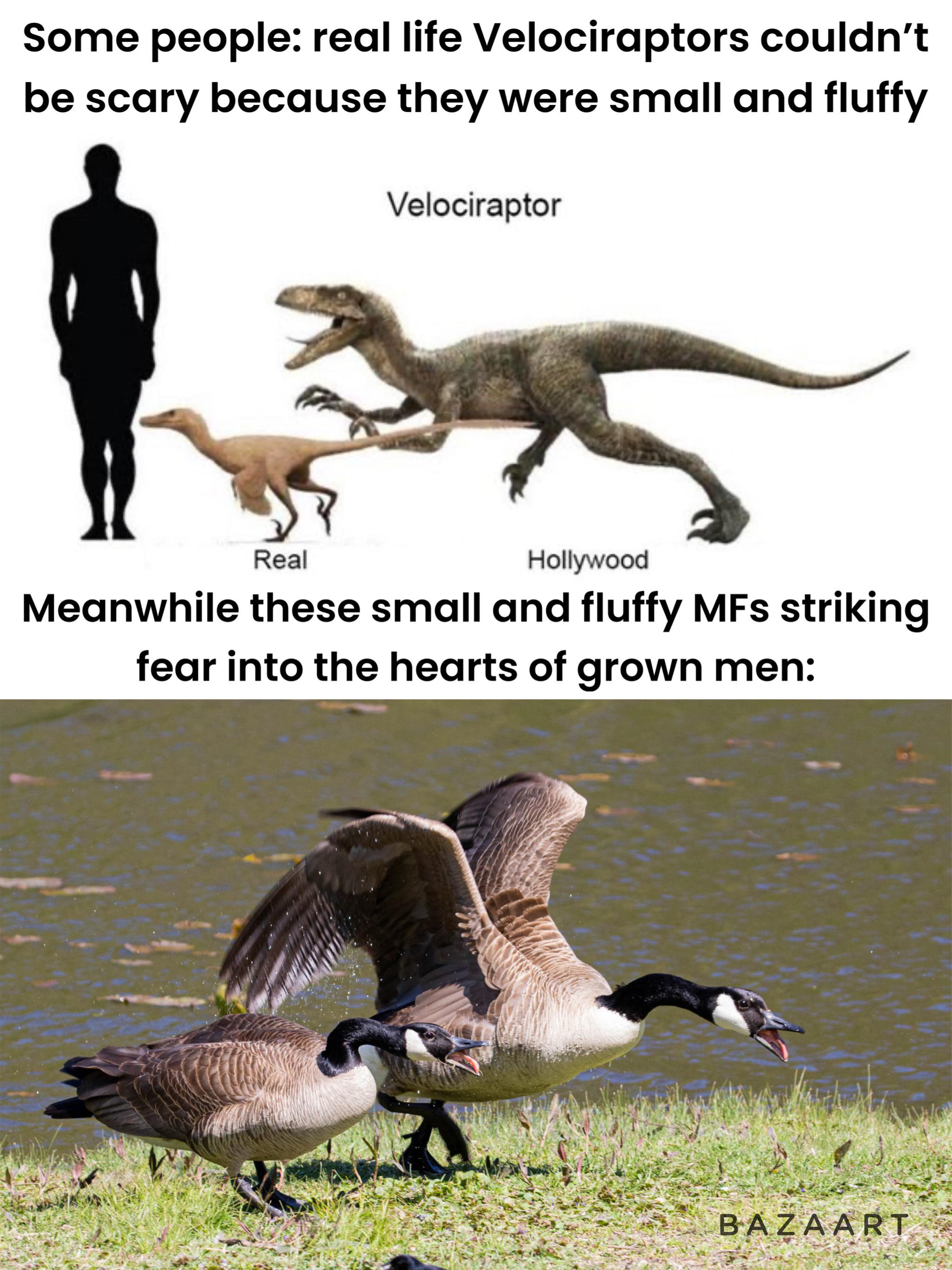 memes: Imagine a predatory Canada Goose with sharp teeth, knives for toes, and 30-something MPH speed. That'd be pretty similar to what real life Velociraptor was.