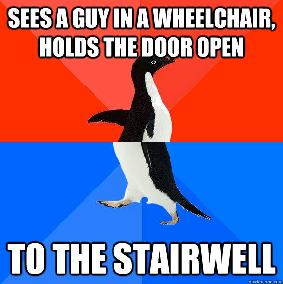 sees a guy in a wheelchair, holds the door open to the stairwell