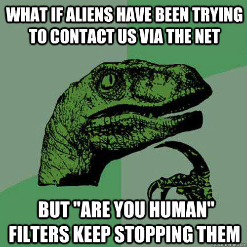 What if aliens have been trying to contact us via the net but "are you human" filters keep stopping them